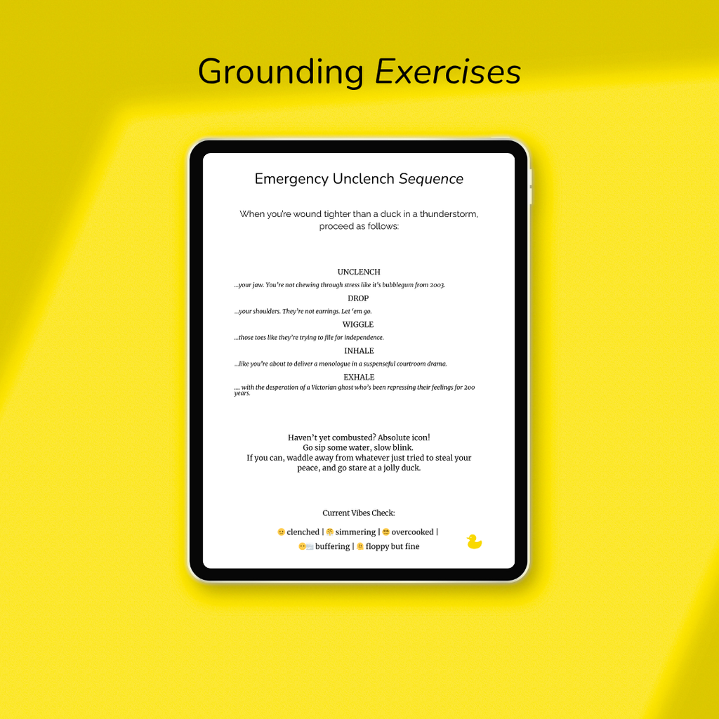 Guided prompts for reflection and self-awareness (without the toxic positivity), grounding exercises and duck-themed mindfulness colouring pages